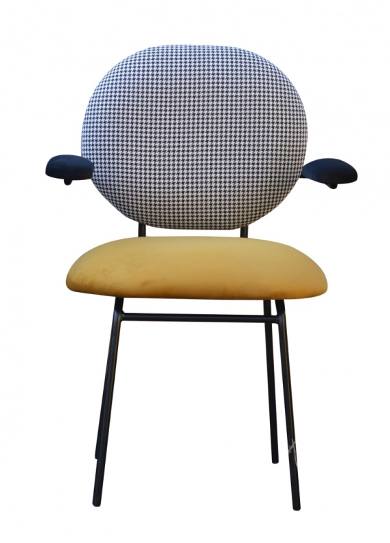 Oryginalny fotel tapicerowany na metalowej podstawie. Forma fotela jest inspirowana wzornictwem lat 70-tych.