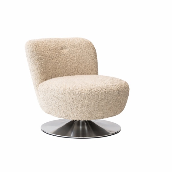 Designerski fotel obrotowy bouclé na chromowanej podstawie