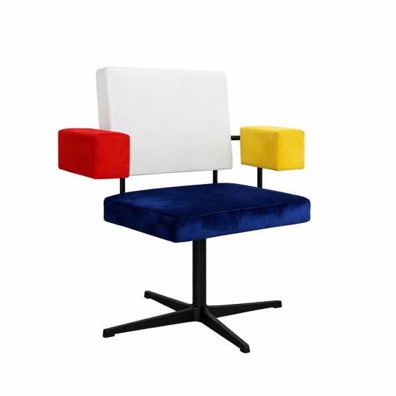 Wir präsentieren das Original Gepolsterter Sitz auf rotierendem Fuß, inspiriert von Piet Mondrian — niederländischer Maler, Mitbegründer der künstlerischen Gruppe De Stijl (1917) und Schöpfer der Neoplastik. Geometrische Form, kontrastierende Farben und ausdrucksstarke Armlehnen bilden ein Möbel, das moderne Kunst mit funktionalem Design verbindet.